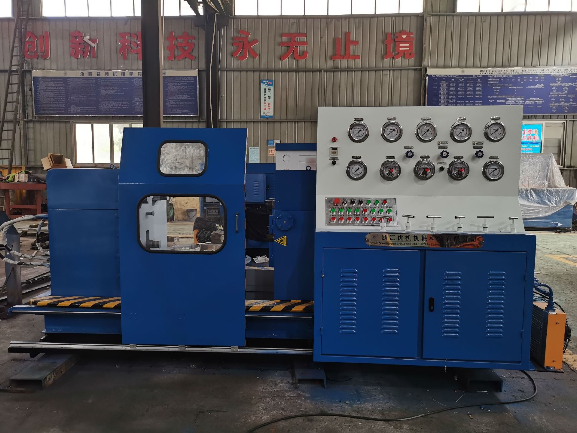 本機(jī)集機(jī)電、液壓、試壓、液體介質(zhì)貯存循環(huán)使用于一體,具有功能完善、性能穩(wěn)定、自動(dòng)化程度高等特點(diǎn)。廣泛用于公稱通徑DNl 5-1000mm的直通式法蘭及螺紋連接各類高、中、低壓閥門的強(qiáng)度、密封和泄漏量等各項(xiàng)性能測(cè)試。測(cè)試介質(zhì):水、氣、油。最高密封試驗(yàn)壓力 32.0MPa,強(qiáng)度48 0MPa。